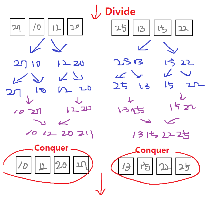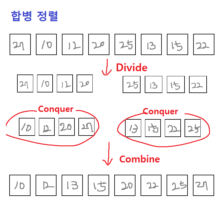 - ํฉ๋ณ ์ ๋ ฌ (merge sort) : ํ๋์ ๋ฆฌ์คํธ๋ฅผ ๋๊ฐ์ ๊ท ๋ฑํ ํฌ๊ธฐ๋ก ๋ถํ ํ๊ณ ๋ถํ ๋ ๋ถ๋ถ๋ฆฌ์คํธ๋ฅผ ์ ๋ ฌํ ๋ค์, ๋ ๊ฐ์ ์ ๋ ฌ๋ ๋ถ๋ถ ๋ฆฌ์คํธ๋ฅผ ํฉํ๋ค. (๋ถํ ์ ๋ณต๊ธฐ๋ฒ ๋ฐํ์ ๋๊ณ ์๋ค.)