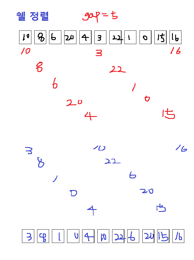 - ์ ์ ๋ ฌ (shell sort) : Donald L. Shell ์ด๋ผ๋ ์ฌ๋์ด ์ ์ํ ๋ฐฉ๋ฒ, ์ฝ์ ์ ๋ ฌ์ด ์ด๋์ ๋ ์ ๋ ฌ๋ ๋ฐฐ์ด์ ๋ํด์ ๋น ๋ฅธ ๊ฒ์ ๋ํ์ฌ ์ฐฉ์ํ ๋ฐฉ๋ฒ์ด๋ค. ๊ฐ๊ฒฉ(๊ฐญ)์ ๋๊ณ ์ฌ๋ฌ๊ฐ์ ๋ถ๋ถ ๋ฆฌ์คํธ๋ฅผ ๋ง๋ค๊ณ , ๊ฐ ๋ถ๋ถ๋ฆฌ์คํธ์ ์ฝ์ ์ ๋ ฌ์ ์ด์ฉํ์ฌ ์ ๋ ฌํ๋ค. ์ฒซ๋ฒ์งธ ํจ์ค๊ฐ ๋๋๋ฉด ๊ฐ๊ฒฉ์ 1/2 ์ค์ฌ์ ๋ค์ ๋ถ๋ถ ๋ฆฌ์คํธ๋ฅผ ๋ง๋ค๊ณ ๊ณผ์ ์ ๋ฐ๋ณตํ๋ค. ๋ถ๋ถ ๋ฆฌ์คํธ ๊ฐ์๊ฐ 1๊ฐ๊ฐ ๋ ๋๊น์ง ๋ฐ๋ณตํ๋ค. (๋ถ๋ถ๋ฆฌ์คํธ ์์ฑ - ๋ถ๋ถ๋ฆฌ์คํธ์ ๋ ฌ)