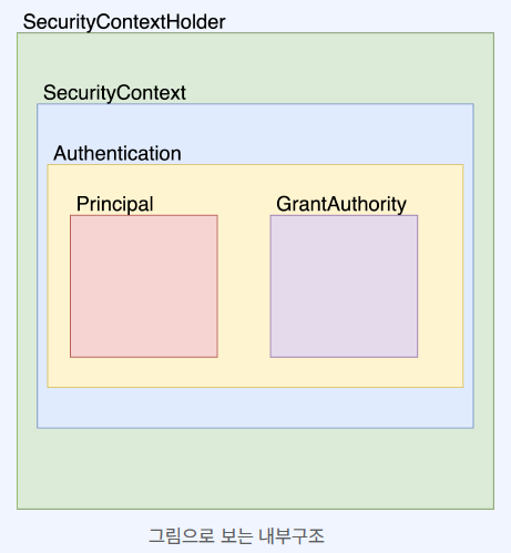 | SecurityContextHolder | ์ธ์ฆ ์ ๋ณด๋ฅผ ์ ์ฅ ๋ฐ ์กฐํ. SecurityContextHolder : ์คํ๋ง ์ํ๋ฆฌํฐ์ ์ธ๋ฉ๋ชจ๋ฆฌ ์ธ์ ์ ์ฅ์ |