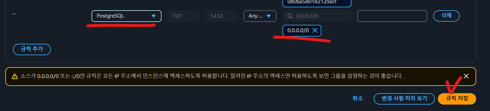 ๊ท์น ์ถ๊ฐ > postgre / ์ฃผ์ 0.0.0.0/0 > ๊ท์น์ ์ฅ